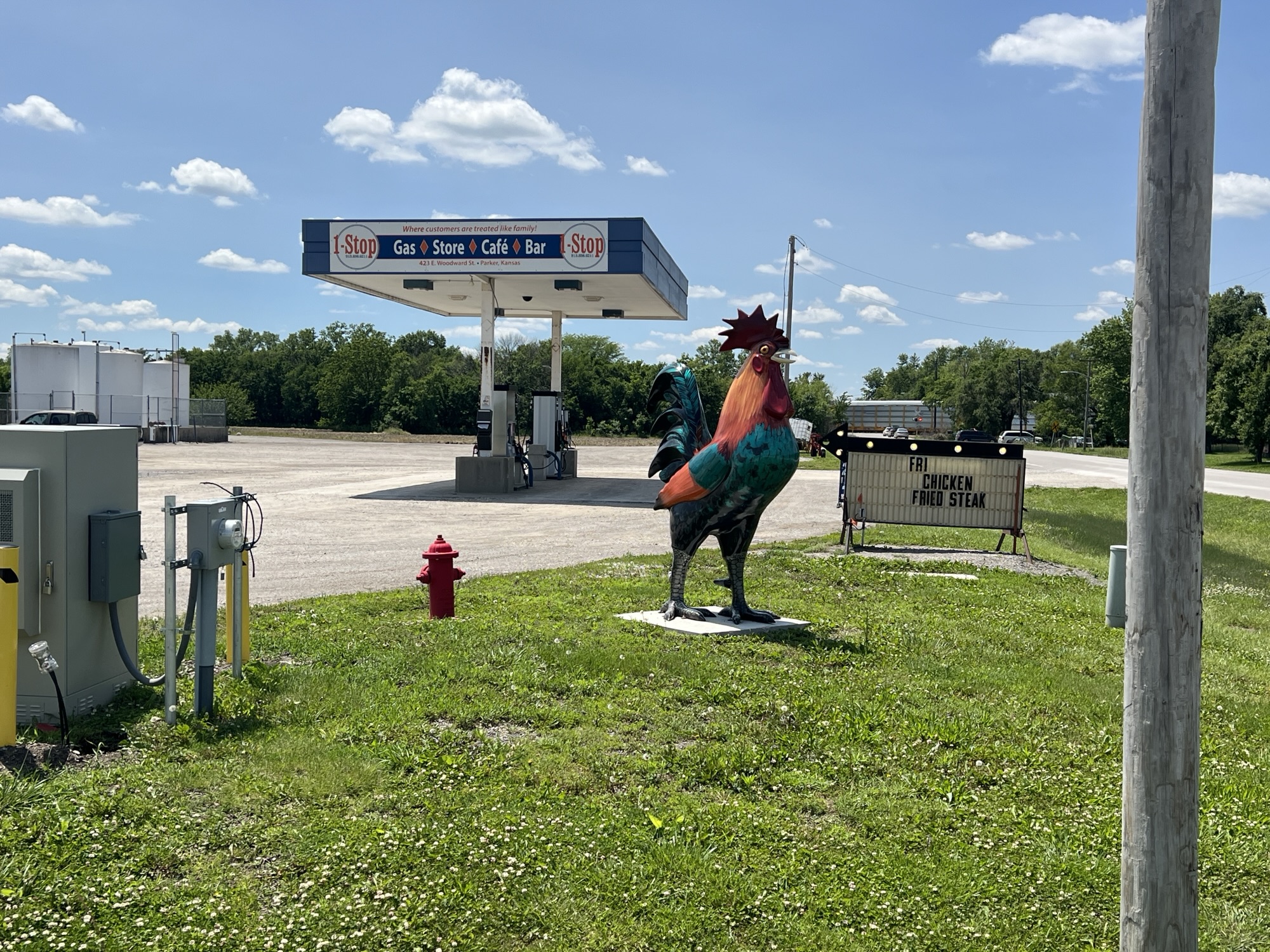 Now, you gotta hear about this: theyâve got this 10-foot rooster out front. Itâs a local landmark, and every time I ride through with cyclists from WarmShowers.org, I make sure we get a picture with that big bird.