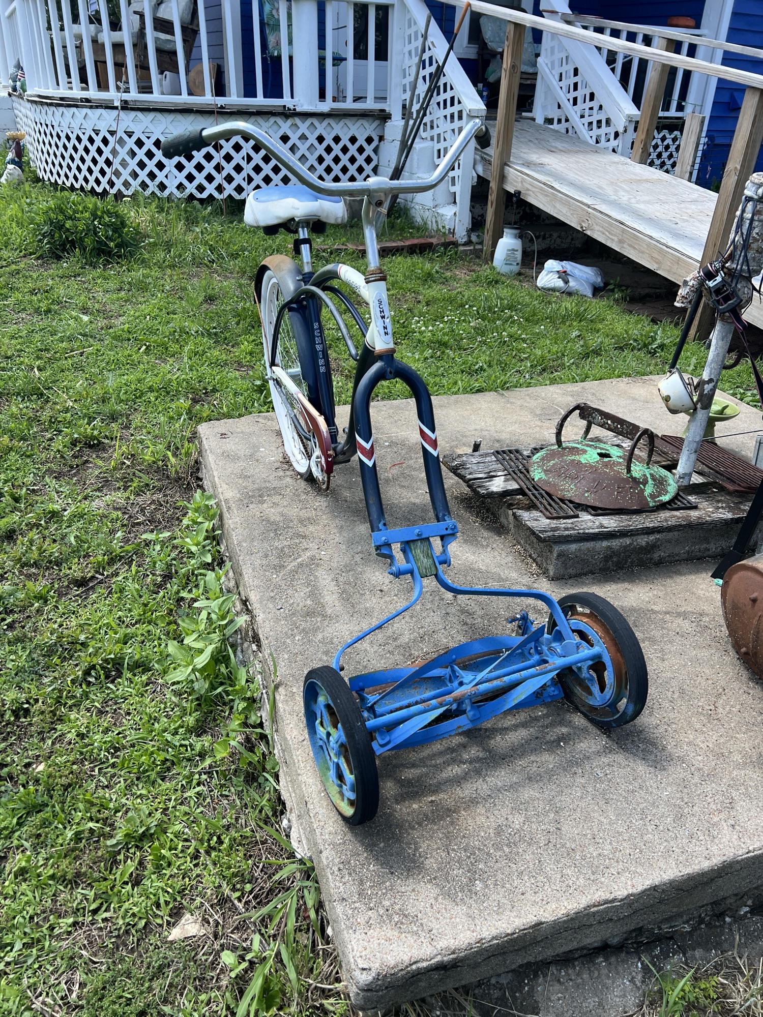 This picture is what got me initially stopped to chat with this guy seeing this bicycle lawnmower and I asked him if I could get a picture of this. I thought it was kind of neat. He said a nephew or somebody had bought this bike and was going to write it to lose weight and end up, breaking the pedals off of it so aborted the weight loss program